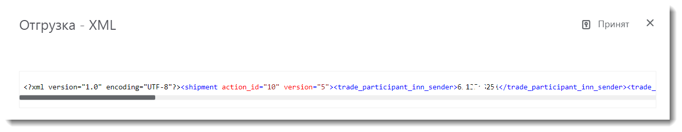 Вариант xml-файла, как способ перегрузки данных из учетной системы в ГИС МТ, не вызвал бы вопросов, если бы не формат вывода данных в ЛК «Честный знак» в виде строки. Например, документ «Отгрузка» в ЛК «Честный знак» предстанет перед грузоотправителем и грузополучателем в следующем виде.
